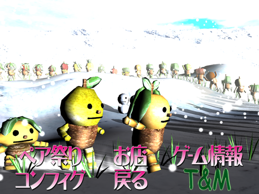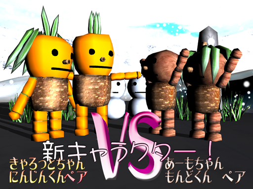 T&Mのペア・キャラクター達が集合。新キャラクターきゃろっとちゃんとにんじんくんとおおねちゃんとだいこんくんの登場です。寒い雪の中、ペア格闘祭りの始まりです。